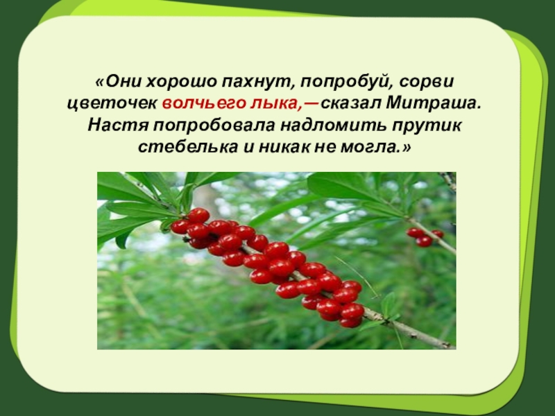 Слайд 23«Они хорошо пахнут, попробуй, сорви цветочек волчьего лыка,—сказал Митраша.