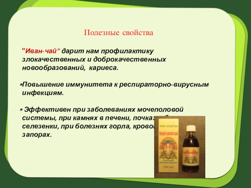 Слайд 8"Иван-чай" дарит нам профилактику злокачественных и доброкачественных новообразований, кариеса.