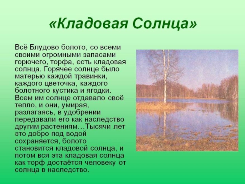 сказке-были М.М. Пришвина «Кладовая солнца» и она имеет практическую направленность, значительно дополняет учебный материал, позволяет узнать целебные свойства ягод и трав и их пользу для организма, которую переоценить невозможно.