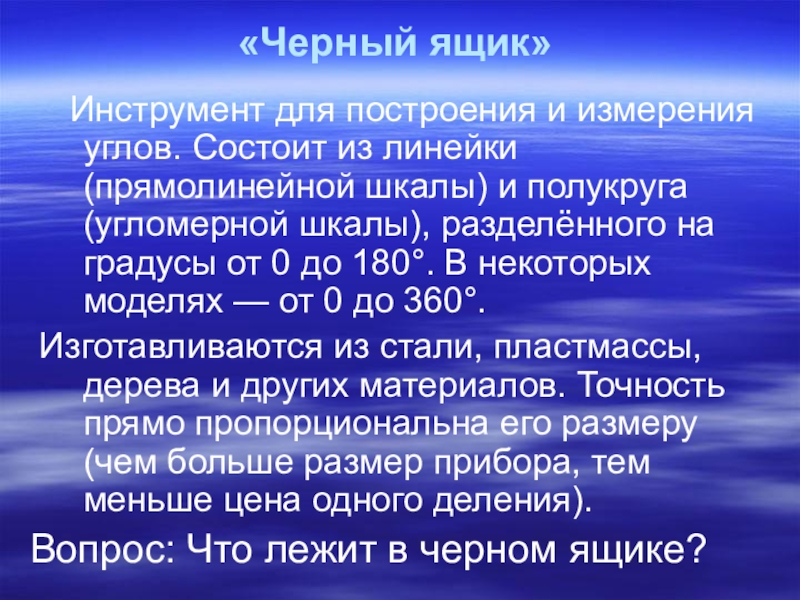 из линейки (прямолинейной шкалы) и полукруга (угломерной шкалы), разделённого на градусы от 0 до 180°. В некоторых моделях — от 0 до 360°.
