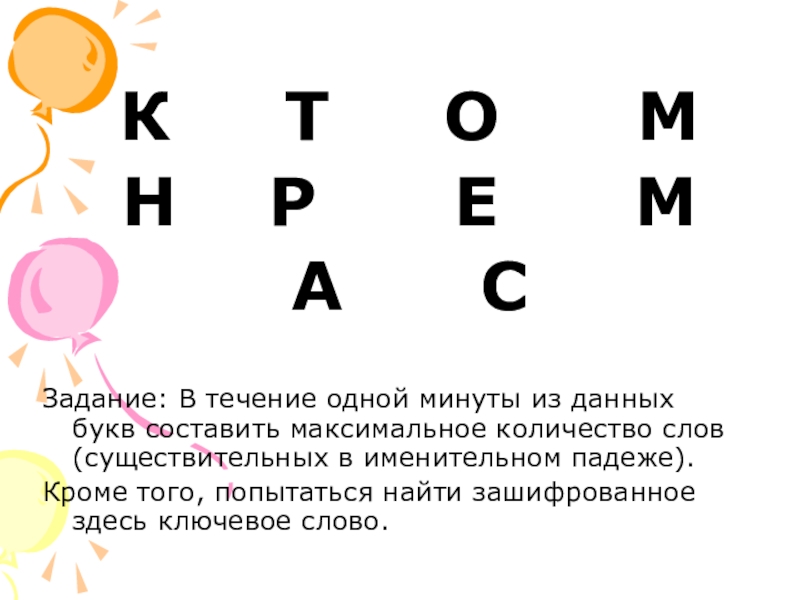 Задание: В течение одной минуты из данных букв составить максимальное количество слов (существительных в именительном падеже).