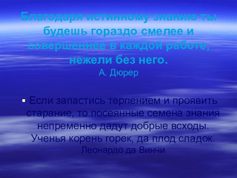 Если запастись терпением и проявить старание, то посеянные семена знания непременно дадут добрые всходы. Ученья корень горек, да плод сладок.