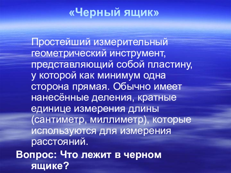 представляющий собой пластину, у которой как минимум одна сторона прямая. Обычно имеет нанесённые деления, кратные единице измерения длины (сантиметр, миллиметр), которые используются для измерения расстояний.