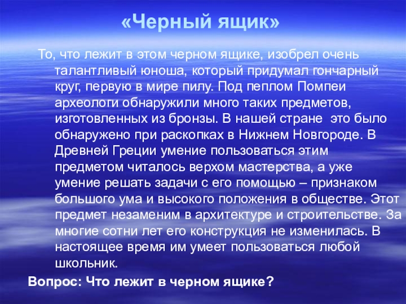талантливый юноша, который придумал гончарный круг, первую в мире пилу. Под пеплом Помпеи археологи обнаружили много таких предметов, изготовленных из бронзы. В нашей стране это было обнаружено при раскопках в Нижнем Новгороде. В Древней Греции умение пользоваться этим предметом читалось верхом мастерства, а уже умение решать задачи с его помощью – признаком большого ума и высокого положения в обществе. Этот предмет незаменим в архитектуре и строительстве. За многие сотни лет его конструкция не изменилась. В настоящее время им умеет пользоваться любой школьник.
