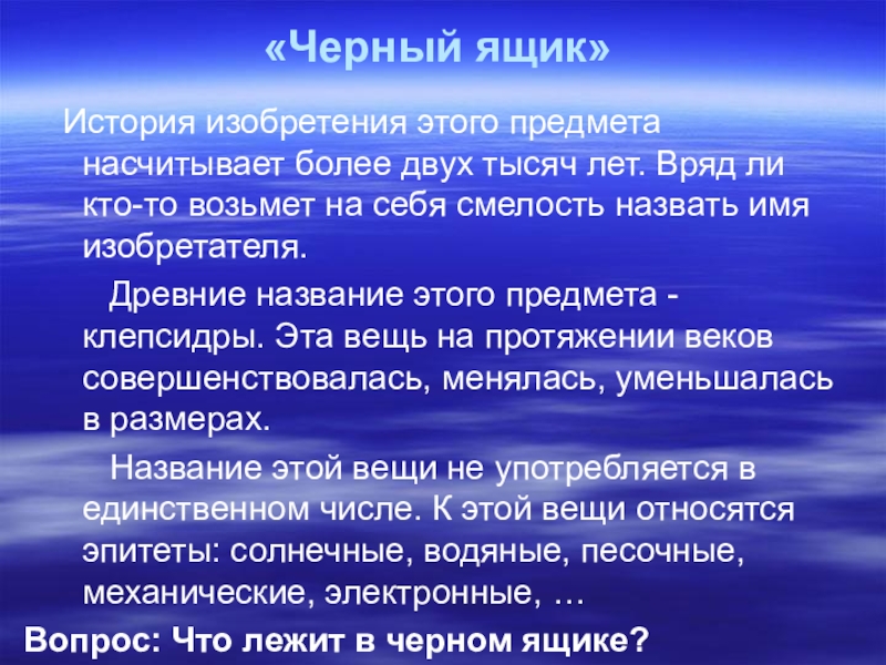 Древние название этого предмета - клепсидры. Эта вещь на протяжении веков совершенствовалась, менялась, уменьшалась в размерах.