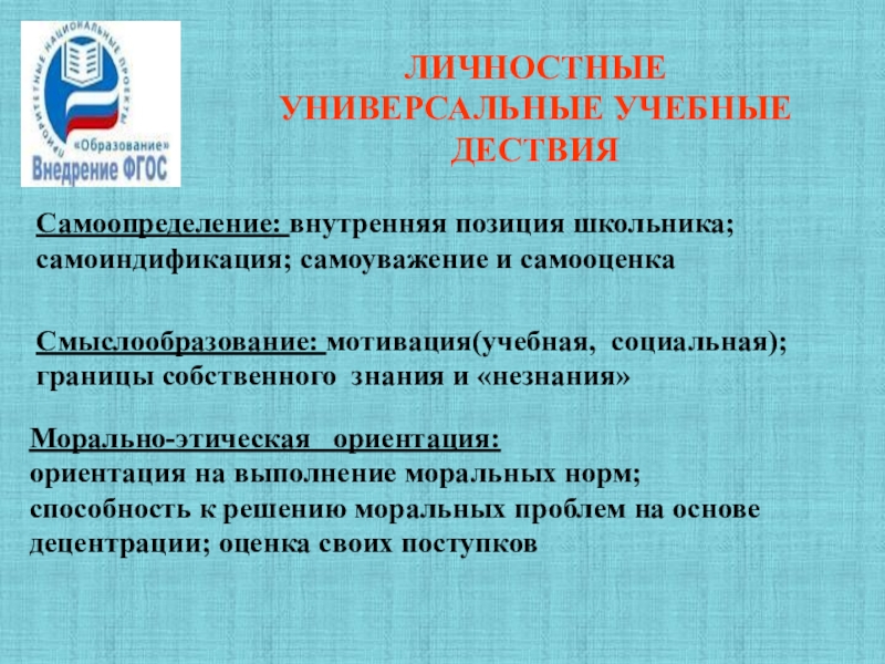 Слайд 4ЛИЧНОСТНЫЕ УНИВЕРСАЛЬНЫЕ УЧЕБНЫЕ ДЕСТВИЯ