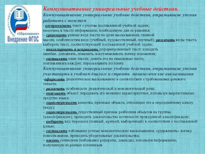 Коммуникативные: речевая деятельность; навыки сотрудничества