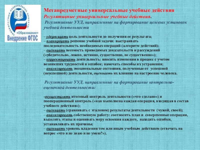 Регулятивные УУД, направленные
