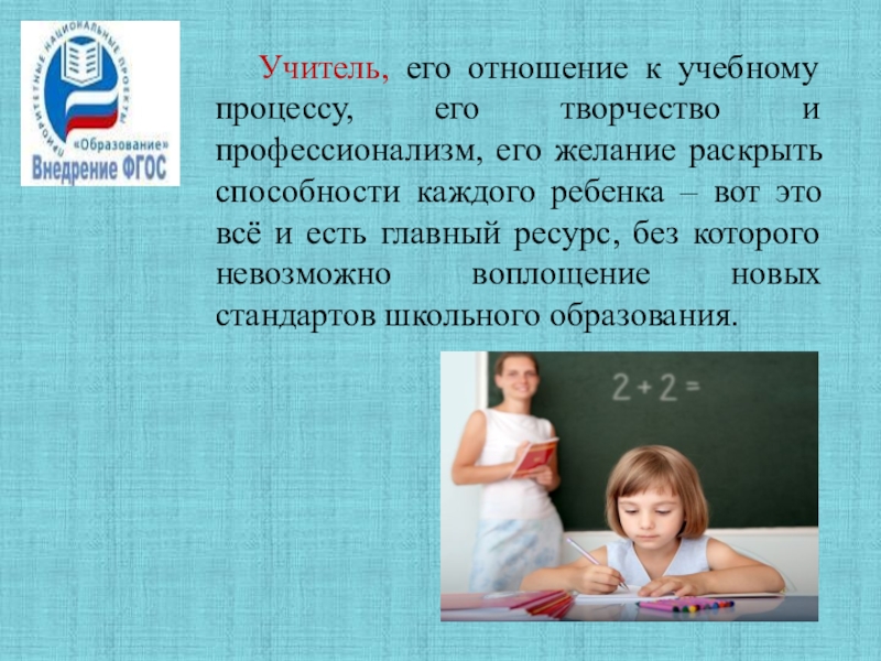 желание раскрыть способности каждого ребенка – вот это всё и есть главный ресурс, без которого невозможно воплощение новых стандартов школьного образования.