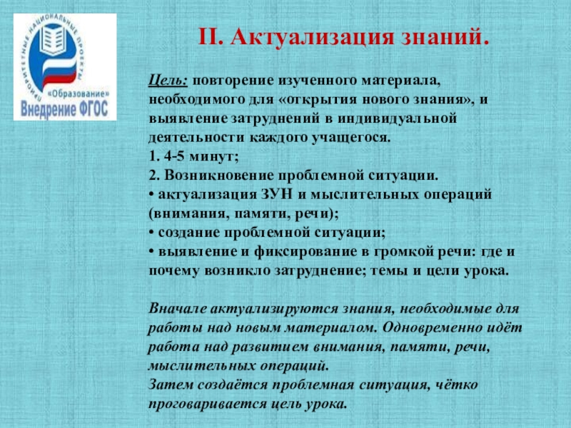 • актуализация ЗУН и мыслительных операций (внимания, памяти, речи);