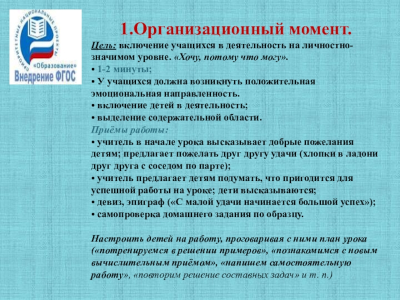 Настроить детей на работу, проговаривая с ними план урока («потренируемся в решении примеров», «познакомимся с новым вычислительным приёмом», «напишем самостоятельную работу», «повторим решение составных задач» и т. п.)