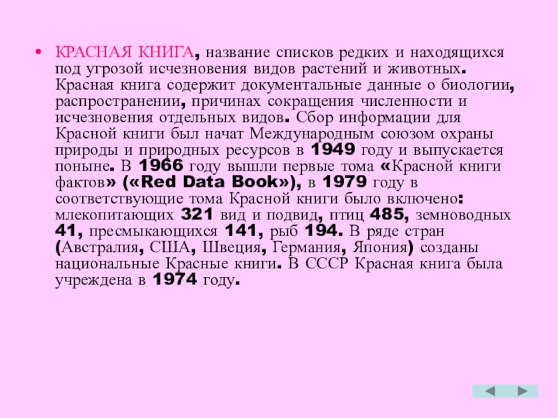 растений и животных. Красная книга содержит документальные данные о биологии, распространении, причинах сокращения численности и исчезновения отдельных видов. Сбор информации для Красной книги был начат Международным союзом охраны природы и природных ресурсов в 1949 году и выпускается поныне. В 1966 году вышли первые тома «Красной книги фактов» («Red Data Book»), в 1979 году в соответствующие тома Красной книги было включено: млекопитающих 321 вид и подвид, птиц 485, земноводных 41, пресмыкающихся 141, рыб 194. В ряде стран (Австралия, США, Швеция, Германия, Япония) созданы национальные Красные книги. В СССР Красная книга была учреждена в 1974 году.