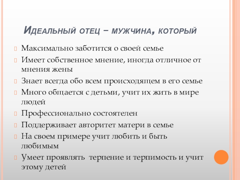 Идеальный отец – мужчина, которыйМаксимально заботится о своей семьеИмеет собственное мнение, иногда отличное от мнения женыЗнает всегда