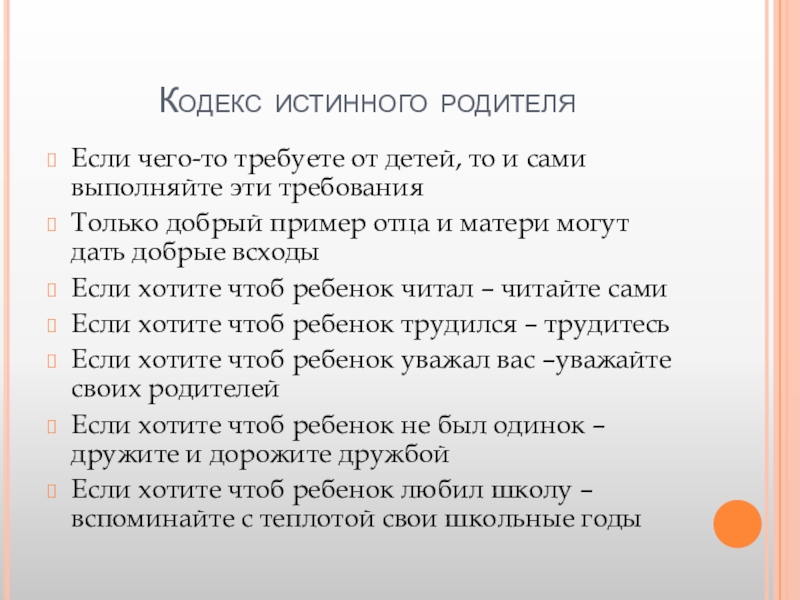Кодекс истинного родителяЕсли чего-то требуете от детей, то и сами выполняйте эти требованияТолько добрый пример отца и