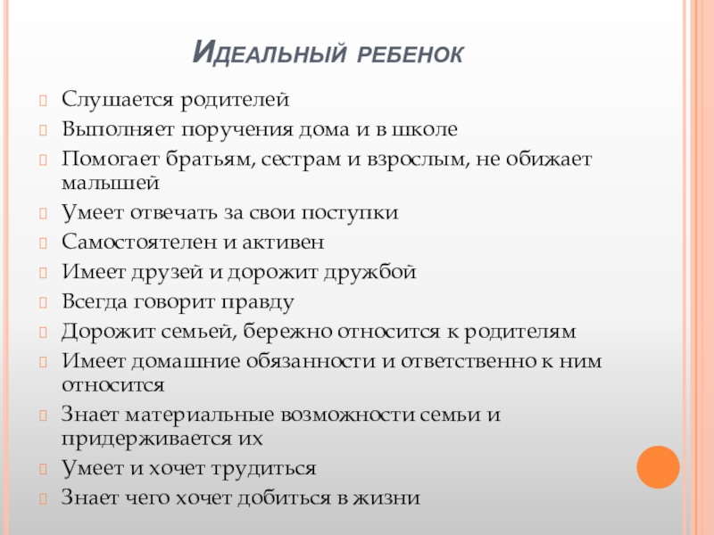 Идеальный ребенокСлушается родителейВыполняет поручения дома и в школеПомогает братьям, сестрам и взрослым, не обижает малышейУмеет отвечать за