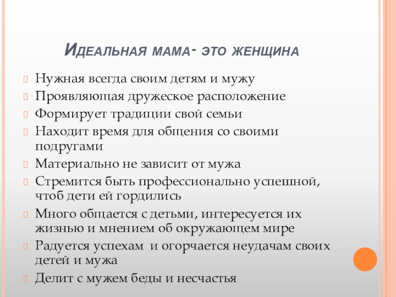 Идеальная мама- это женщинаНужная всегда своим детям и мужуПроявляющая дружеское расположениеФормирует традиции свой семьиНаходит время для общения