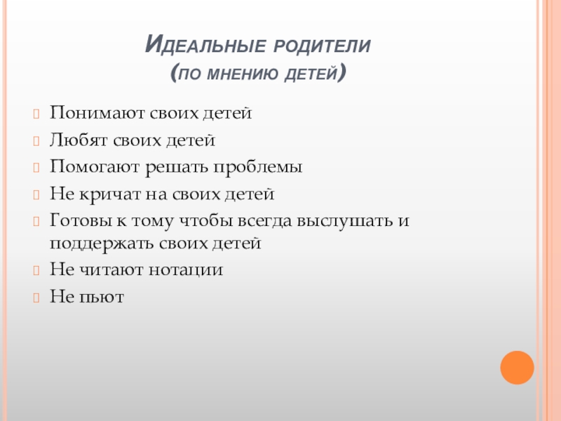 Идеальные родители  (по мнению детей)Понимают своих детейЛюбят своих детейПомогают решать проблемыНе кричат на своих детейГотовы к