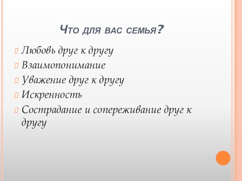 Что для вас семья?Любовь друг к другуВзаимопониманиеУважение друг к другуИскренностьСострадание и сопереживание друг к другу