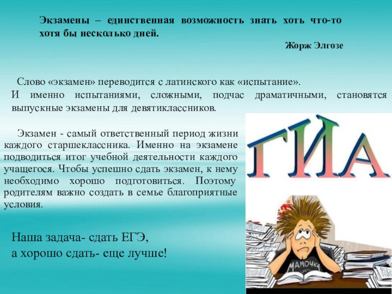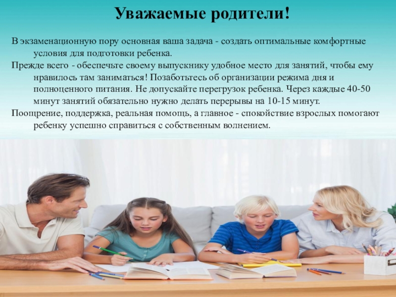 Экзамен - самый ответственный период жизни каждого старшеклассника. Именно на экзамене подводиться итог учебной деятельности каждого учащегося. Чтобы успешно сдать экзамен, к нему необходимо хорошо подготовиться. Поэтому родителям важно создать в семье благоприятные условия.