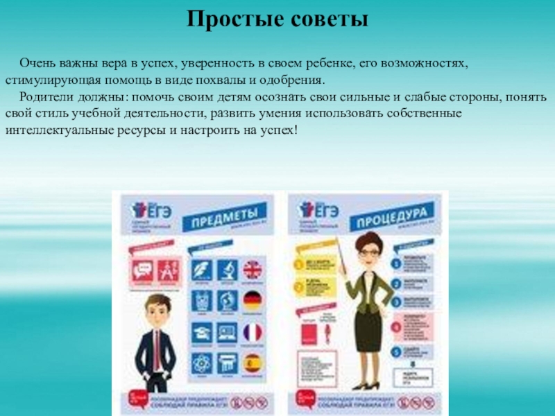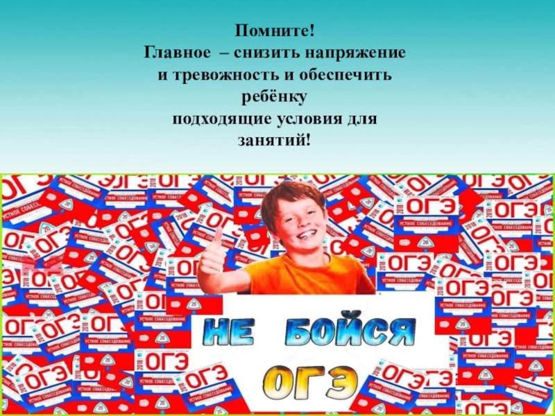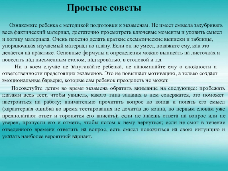 Посоветуйте детям во время экзамена обратить внимание на следующее: пробежать глазами весь тест, чтобы увидеть, какого типа задания в нем содержатся, это поможет настроиться на работу; внимательно прочитать вопрос до конца и понять его смысл (характерная ошибка во время тестирования не дочитав до конца, по первым словам уже предполагают ответ и торопятся его вписать); если не знаешь ответа на вопрос или не уверен, пропусти его и отметь, чтобы потом к нему вернуться; если не смог в течение отведенного времени ответить на вопрос, есть смысл положиться на свою интуицию и указать наиболее вероятный вариант.