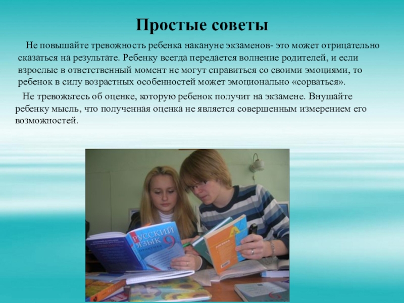 Не тревожьтесь об оценке, которую ребенок получит на экзамене. Внушайте ребенку мысль, что полученная оценка не является совершенным измерением его возможностей.