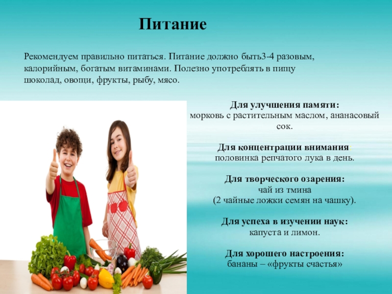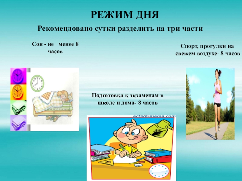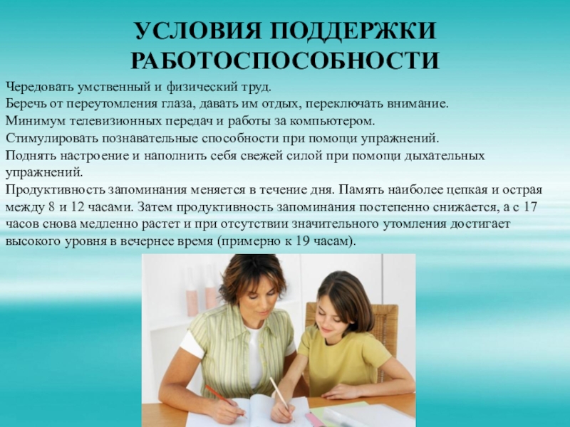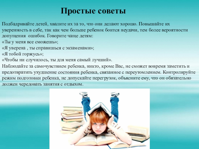 Наблюдайте за самочувствием ребенка, никто, кроме Вас, не сможет вовремя заметить и предотвратить ухудшение состояния ребенка, связанное с переутомлением. Контролируйте режим подготовки ребенка, не допускайте перегрузок, объясните ему, что он обязательно должен чередовать занятия с отдыхом.