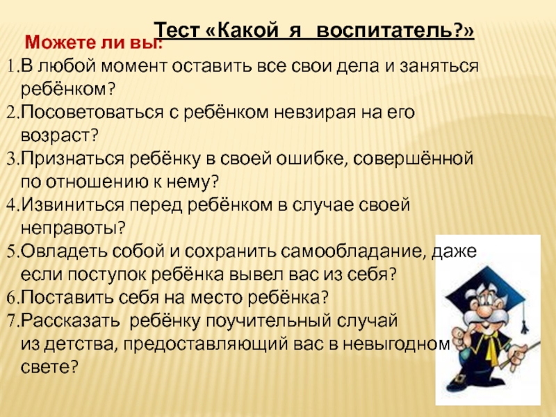 5 – 6 баллов: Забота о ребёнке для вас вопрос важный. Вы имеете способности воспитателя, но на практике их применяете непоследовательно. Порой вы очень строги, или же чересчур добры. Вам следует серьёзно задуматься над своим подходом к воспитанию ребёнка.