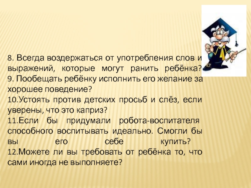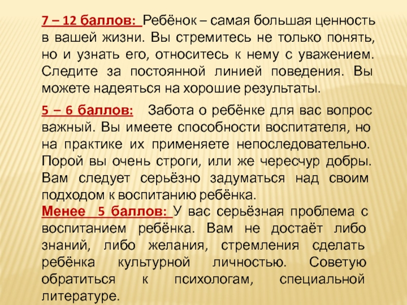 Менее 5 баллов: У вас серьёзная проблема с воспитанием ребёнка. Вам не достаёт либо знаний, либо желания, стремления сделать ребёнка культурной личностью. Советую обратиться к психологам, специальной литературе.
