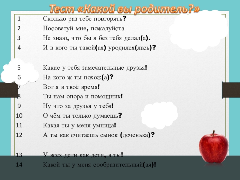 13 – 14 баллов. Идете по неверному пути. Существует недоверие между вами и ребенком. Уделяйте ему больше времени, уважайте его, прислушивайтесь к его мнению.