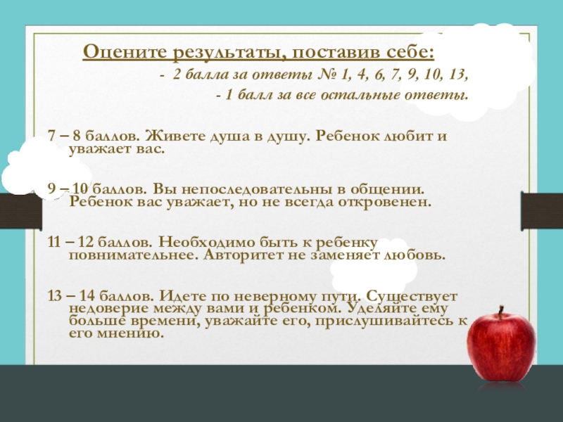 9 – 10 баллов. Вы непоследовательны в общении. Ребенок вас уважает, но не всегда откровенен.