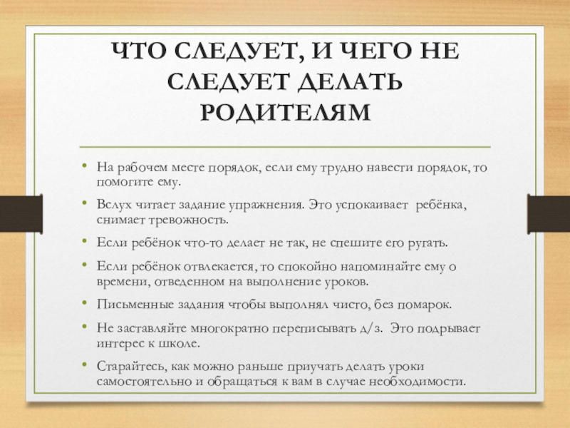 Слайд 15ЧТО СЛЕДУЕТ, И ЧЕГО НЕ СЛЕДУЕТ ДЕЛАТЬ РОДИТЕЛЯМ