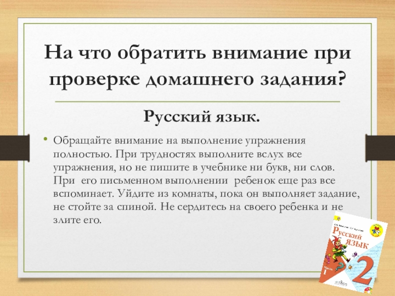 выполнение упражнения полностью. При трудностях выполните вслух все упражнения, но не пишите в учебнике ни букв, ни слов. При его письменном выполнении ребенок еще раз все вспоминает. Уйдите из комнаты, пока он выполняет задание, не стойте за спиной. Не сердитесь на своего ребенка и не злите его.