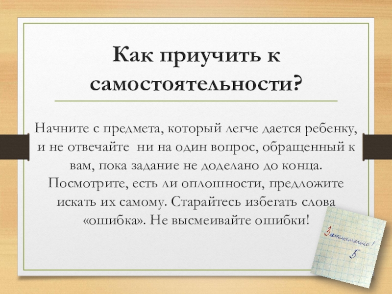 не отвечайте ни на один вопрос, обращенный к вам, пока задание не доделано до конца. Посмотрите, есть ли оплошности, предложите искать их самому. Старайтесь избегать слова «ошибка». Не высмеивайте ошибки!