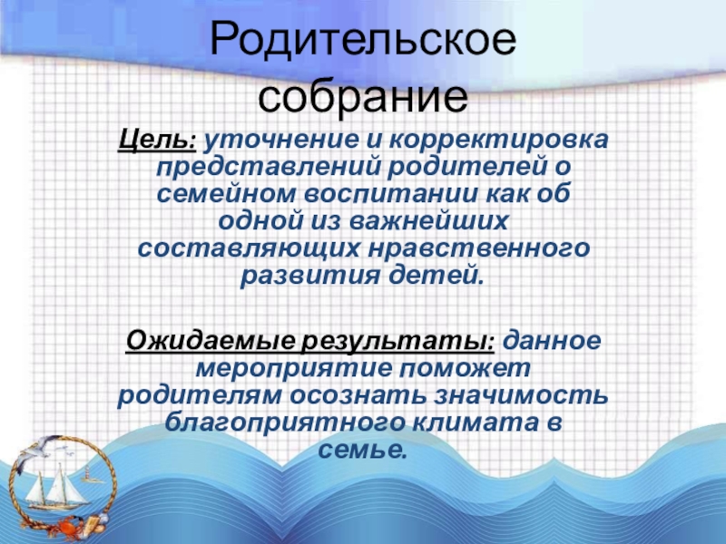 Цель: уточнение и корректировка представлений родителей о семейном воспитании