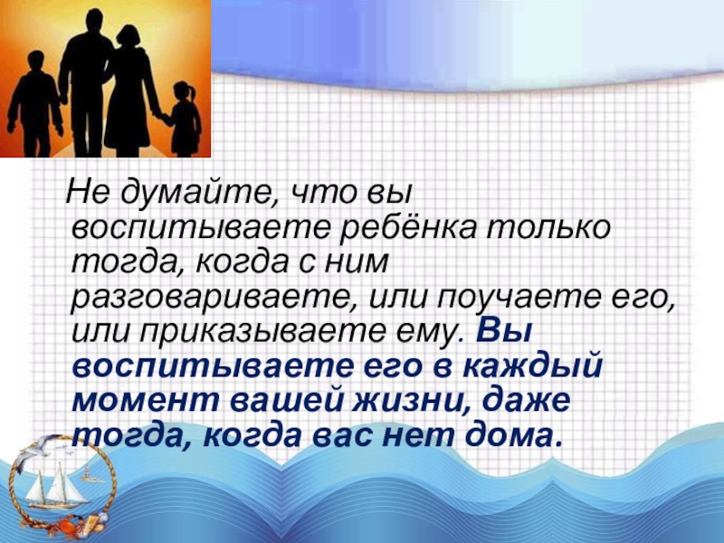Слайд 5 Не думайте, что вы воспитываете ребёнка только тогда, когда