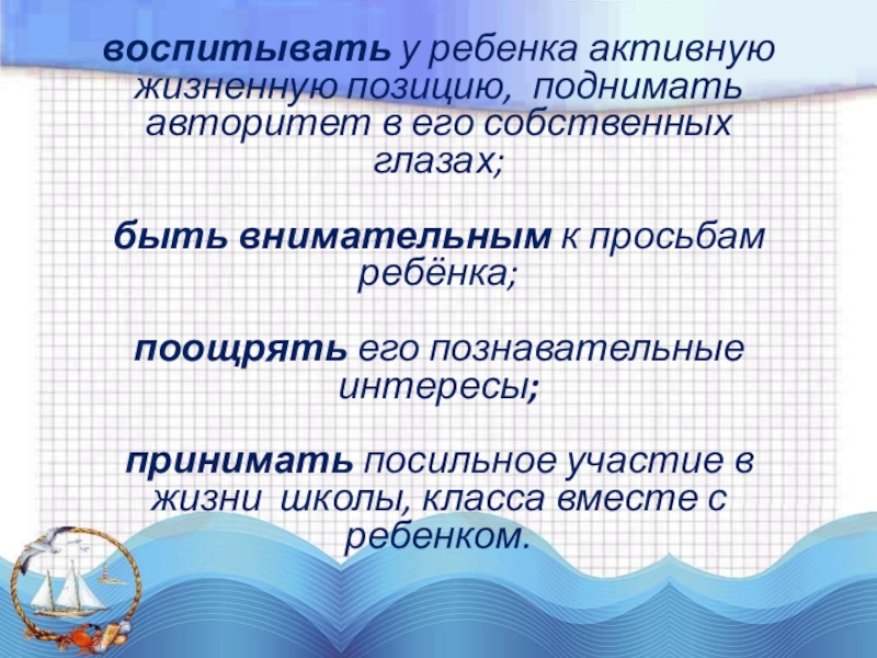 Слайд 16воспитывать у ребенка активную жизненную позицию, поднимать авторитет в его собственных