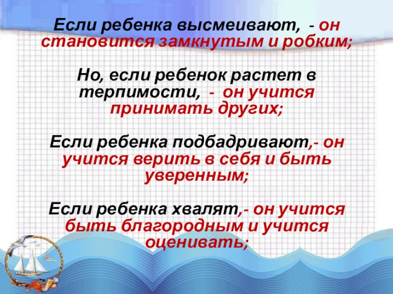 Если ребенка хвалят,- он учится быть благородным и учится оценивать;