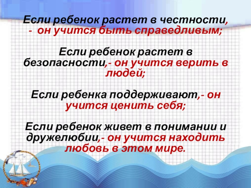 Слайд 29Если ребенок растет в честности, - он учится быть справедливым;