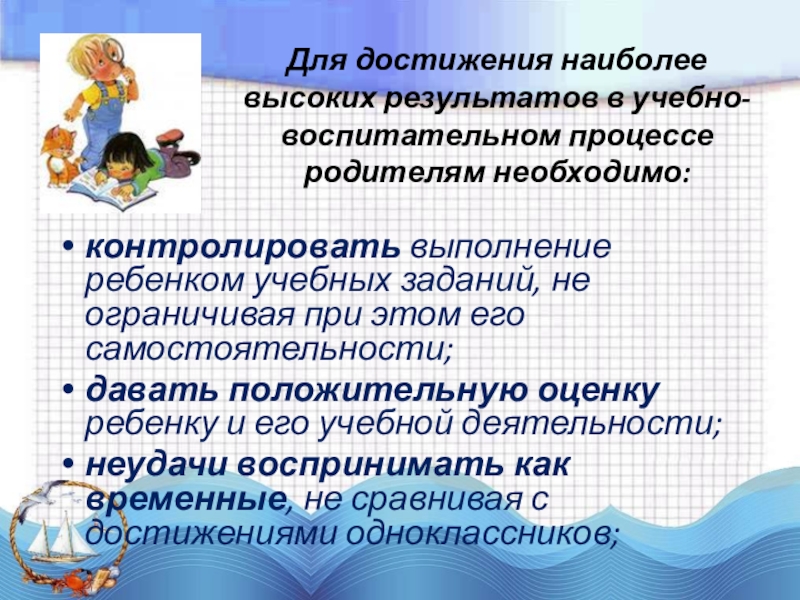 Слайд 15Для достижения наиболее высоких результатов в учебно-воспитательном процессе родителям необходимо: