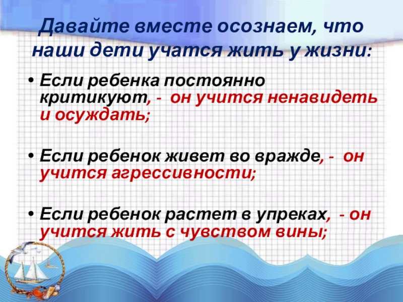 Слайд 27Давайте вместе осознаем, что наши дети учатся жить у жизни: