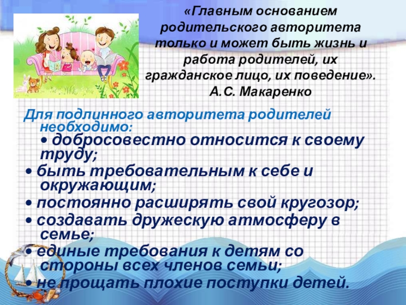 Слайд 12«Главным основанием родительского авторитета только и может быть жизнь и работа