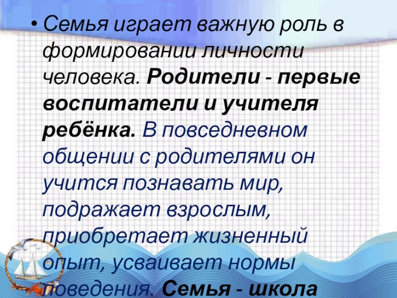 Семья играет важную роль в формировании личности человека. Родители - первые