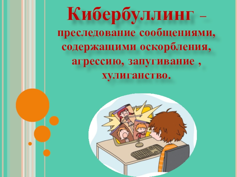 Слайд 7Кибербуллинг – преследование сообщениями, содержащими оскорбления, агрессию, запугивание , хулиганство.