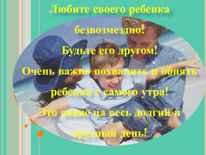 Любите своего ребенка безвозмездно! Будьте его другом! Очень важно похвалить и обнять ребенка с самого утра!