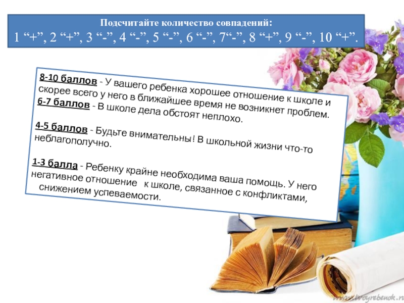 8-10 баллов - У вашего ребенка хорошее отношение к школе и скорее всего у него в ближайшее время не возникнет проблем.
