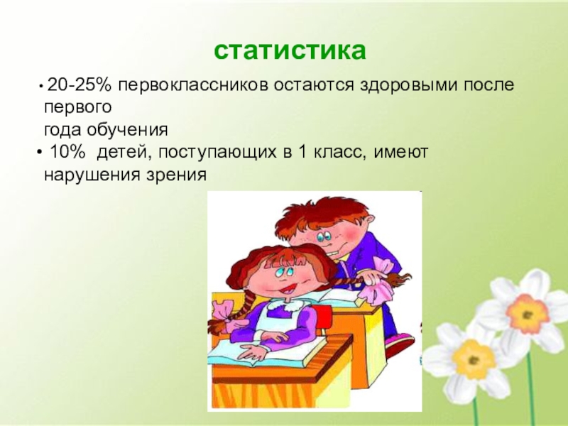 статистика 20-25% первоклассников остаются здоровыми после первого года обучения 10% детей, поступающих в 1 класс, имеют нарушения