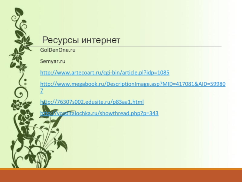 Ресурсы интернетGolDenOne.ruSemyar.ruhttp://www.artecoart.ru/cgi-bin/article.pl?idp=1085http://www.megabook.ru/DescriptionImage.asp?MID=417081&AID=599807http://76307s002.edusite.ru/p83aa1.html http://vospitalochka.ru/showthread.php?p=343