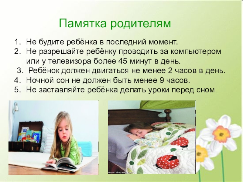 Памятка родителямНе будите ребёнка в последний момент.Не разрешайте ребёнку проводить за компьютером  или у телевизора более