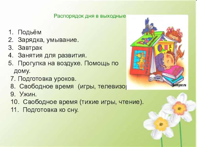 Распорядок дня в выходные дни домаПодьёмЗарядка, умывание.Завтрак Занятия для развития.Прогулка на воздухе. Помощь по дому.7. Подготовка уроков.8.