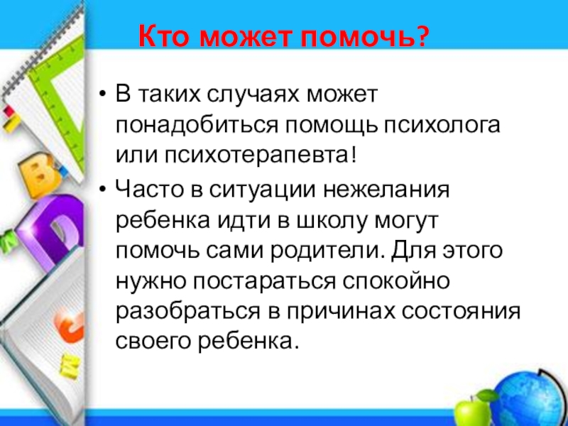 в ситуации нежелания ребенка идти в школу могут помочь сами родители. Для этого нужно постараться спокойно разобраться в причинах состояния своего ребенка.
